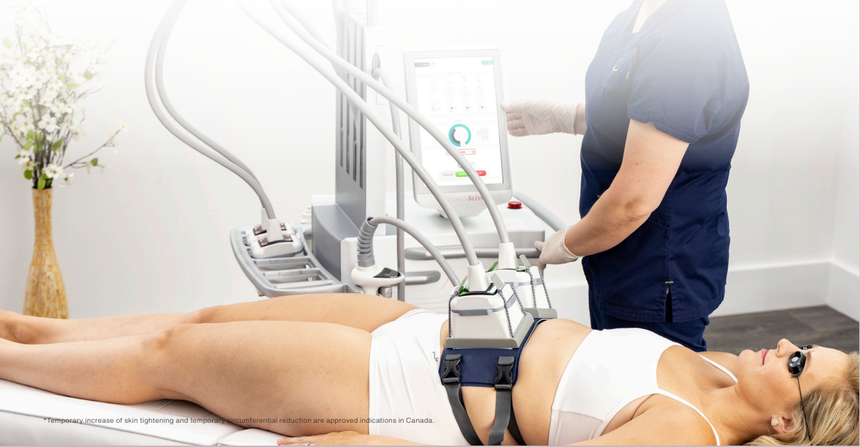 Venus Bliss™ device has a complementary skin tightening and cellulite reduction combined to activate collagen and elastin fibers that is necessary to strengthen the connective tissues of our skin and underneath. This technology is approved by Health Canada for temporary increase of skin tightening, temporary circumferential reduction, and temporary cellulite reduction (Venus Bliss, 2023).